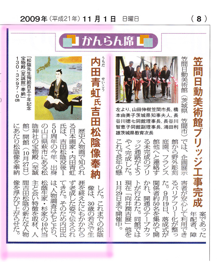 新美術新聞2009.11.1号に吉田松陰像奉納の記事が掲載されました。 |